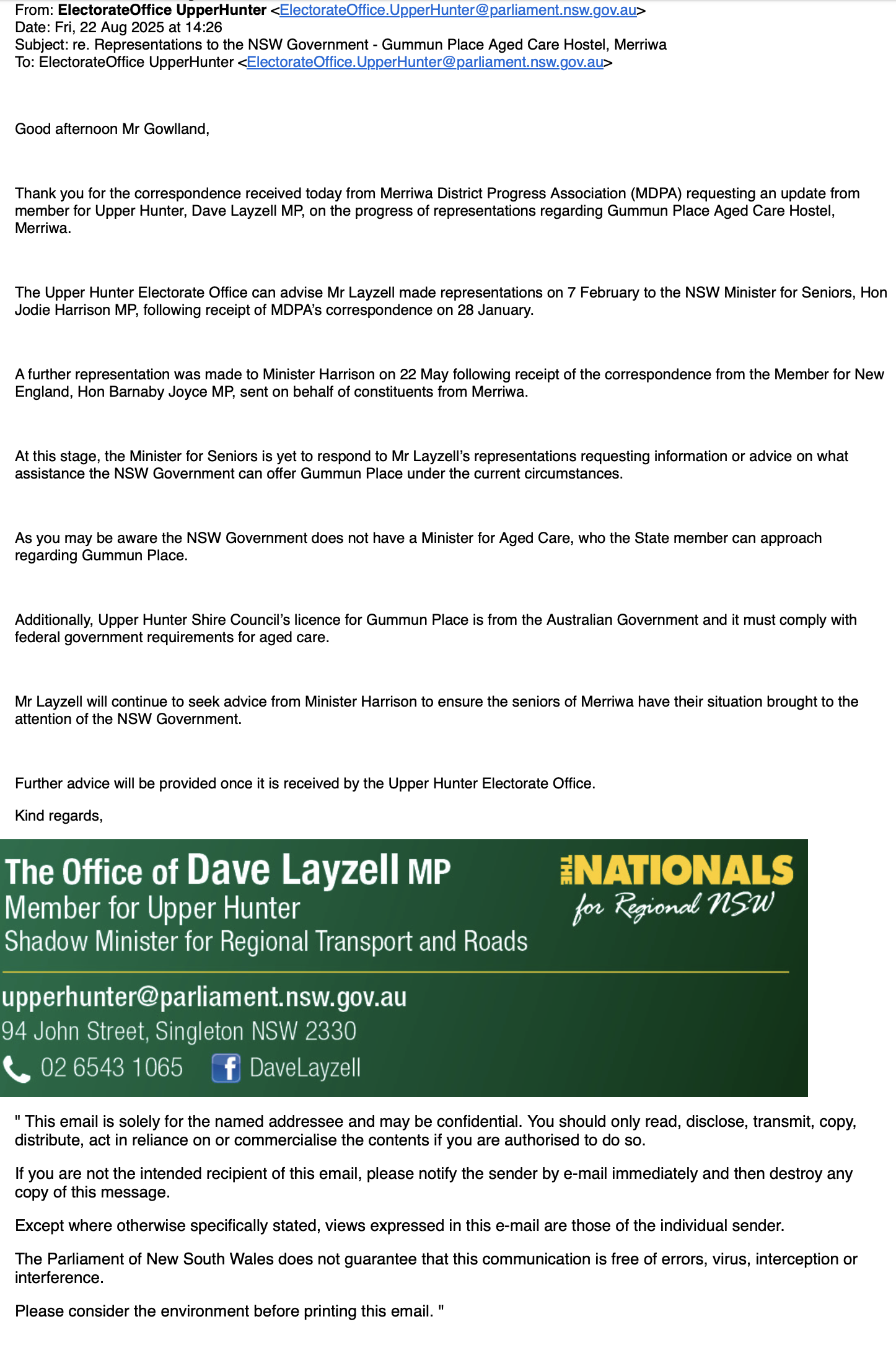 On 22nd August we received an email from Dave Layzell’s office. He has advised that he made representations on 7 February to the NSW Minister for Seniors, Hon Jodie Harrison MP, following receipt of MDPA’s correspondence on 28 January. A further representation was made to Minister Harrison on 22 May. The email went on to say that “Mr Layzell will continue to seek advice from Minister Harrison to ensure the seniors of Merriwa have their situation brought to the attention of the NSW Government.”. Click here to view the email.
